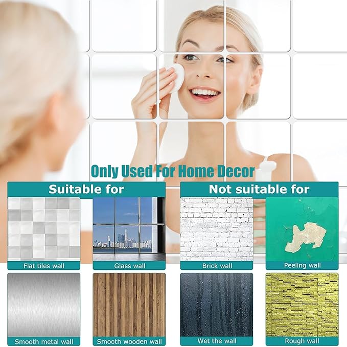 - Acrylic Mirror: The self adhesive mirror is made of acrylic that has a smooth surface and a good texture, which is safer and can avoid scratches and will not break; Each mirror sticker is attached with a protective film on the front side,tearing off the film can show the reflection of the mirror.