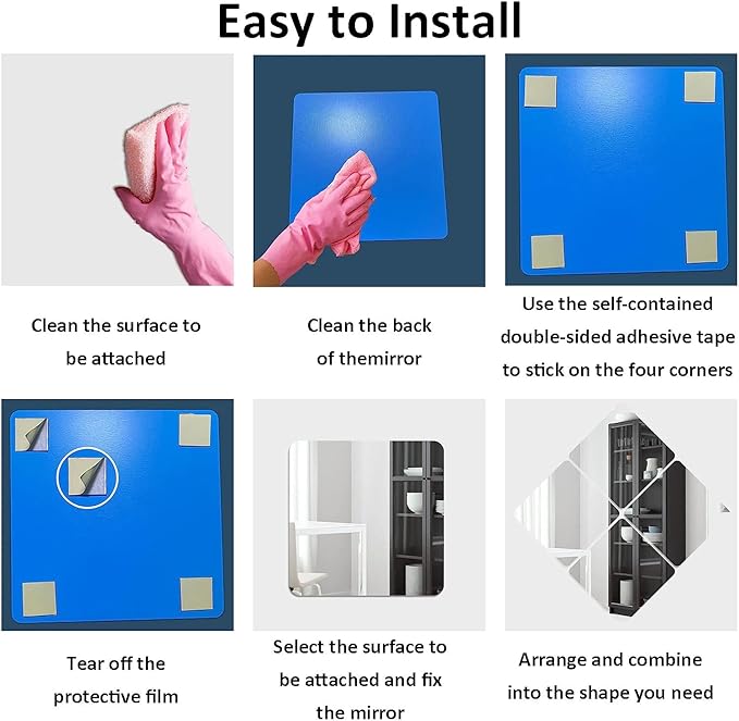 - Self Adhesive Mirror: No need to punch & No damage walls. The mirror wall sticker set comes with 1 pack of High-Sticky Adhesive Tape, which make the wall mirror firmly on the wall without falling off. Before use, please confirm the wall is clean, smooth and dry; After fixed, do not move at will.