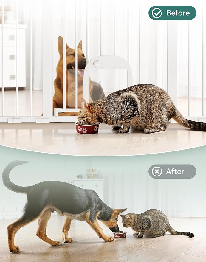 - ADJUSTABLE CAT DOOR: The upgraded 7 x 5.5" cat door can be adjusted left and right in 2 levels, which solves the problem that other pet door gates do not stay locked in place. It is easy to separate pets of different sizes, never worry about dogs stealing cat food