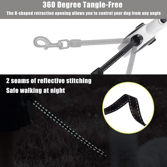 - 🐕【Easy to Use & Control】One-handed brake, pause, lock and unlock, quickly adjust the distance between you and your dog, and keep your dog safe. 360° tangle-free makes retracting easier and smoother, and the U-shape opening design allows you to control your dog from any angle. This is a great design for owners who want to give dogs more freedom while remaining safe and in control at all times.