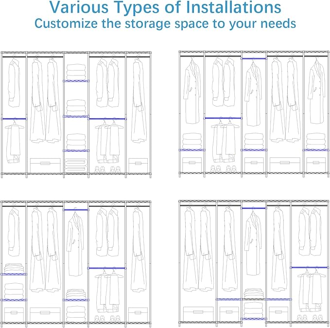 - Versatile Flexible Closet: This open wardrobe can be Installed into different ways. It has adjustable shelves and detachable hanging bars so you can customize the storage. L shape for small spaces like corner, apartment, bedroom; Straight-lined shape for walk-in closet and cloakroom clothing store.