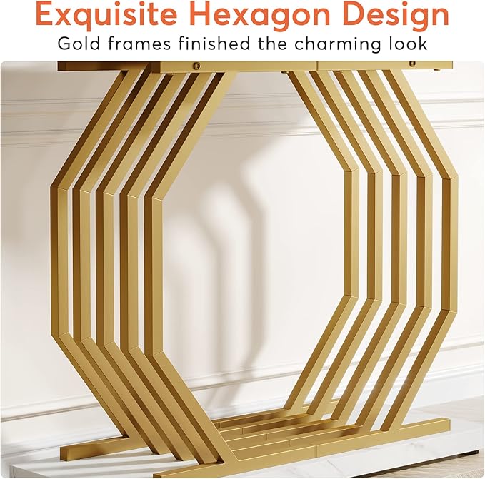 - 【Impressively Console Table】: Your search for the perfect entryway focal point is over! This sleek entryway table features a bold, gold octagon base that lends a modern luxury look, while faux marble white veneer dripping with refined style adorns your space. Brings a finishing touch to your home with this stunning sofa table.
