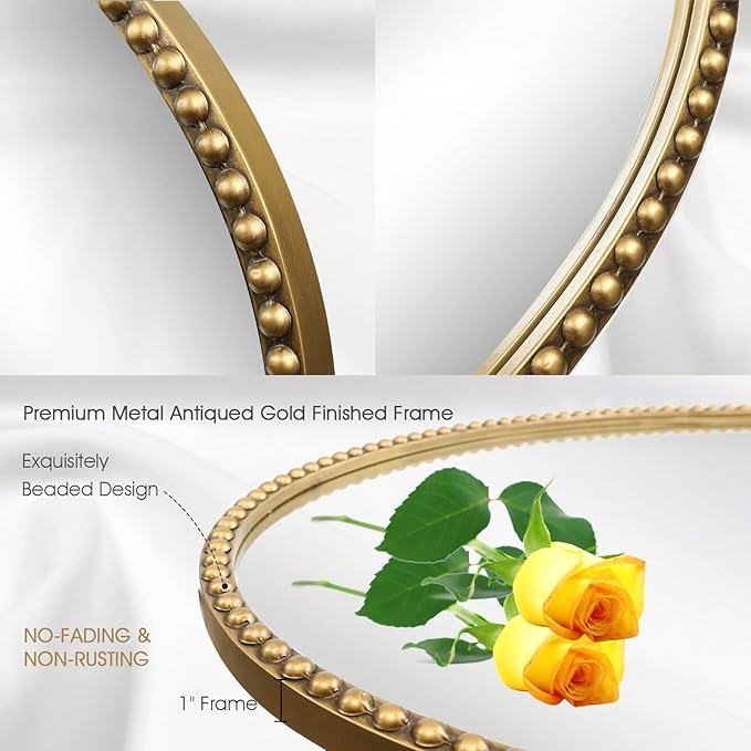 Oval Wall Mirror for Bathroom, 26"x39" Antique Gold Metal Beaded Frame Decorative Accent Mirror, Large Hanging Vanity Mirror for Bedroom, Living Room, Entryway