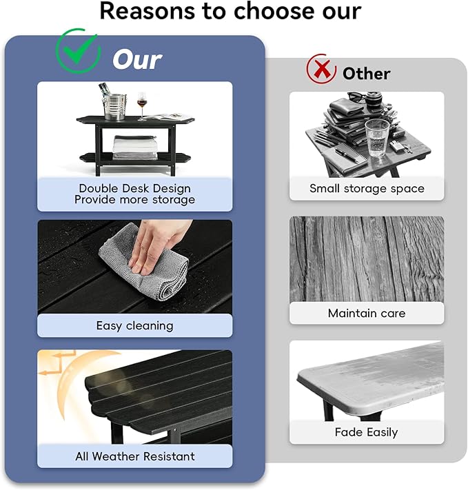 - EASY TO ASSEMBLE AND MAINTAIN: The tabletop has been assembled, just use tools to tighten the screws to easily get end table. The plastic outdoor table is super weather-resistant and easy to clean with soap, a towel or a sanding sponge, no other protection is required.