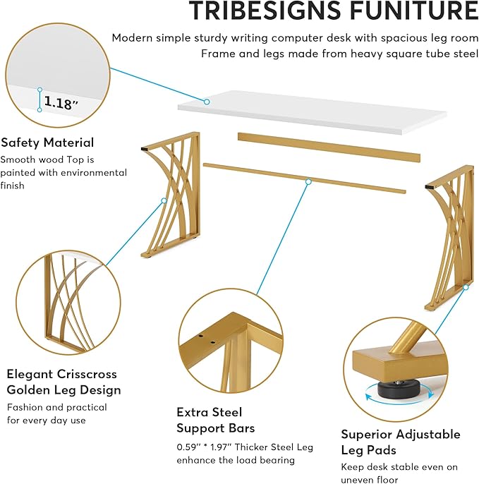- Sturdy, Stable & Reliable: : The tabletop of this white and gold vanity desk is made of 1.97'' extra-thick high-quality environmentally E1 particleboard. The frame of this computer table is made of thick stainless steel tube, which increases its bearing capacity. It is anti-scratch, stain-resistant and water resistant. The Max Weight Capacity is about 250 lbs.