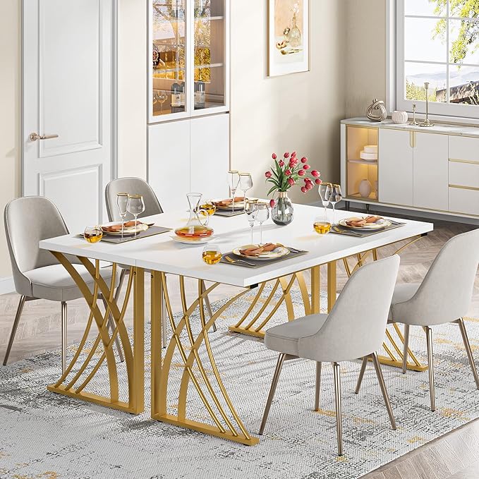 LITTLE TREE 55’’ Large Modern Computer Desk, White & Gold Luxury Laptop PC Student Table, Makeup Vanity Table with Thick Frame & Strong Legs, Sturdy Writing Workstation for Home & Office