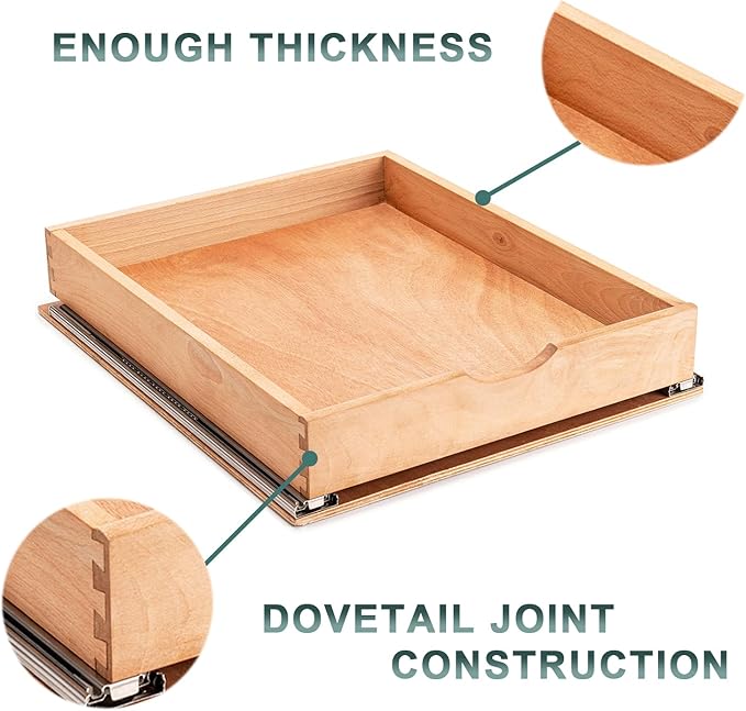 - EXCELLENT QUALITY: pull out drawers for kitchen cabinets are made of 0.59" in thick knotless SPLOD BEECH WOOD, 0.34" in thick Eco-board bottom, Drawer has no nails or screws, but dovetail joints keep our drawers strong and sturdy.