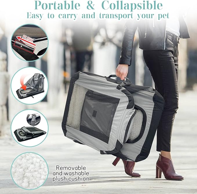 Fhiny Large Cat Carrier for 2 Cats, 24"x17"x17" Soft Dog Crate Collapsible Portable Travel Pet Carrier Bag Durable Breathable Foldable Kitten Carrier Bag for Puppy Cats Under 45 Lbs Grey
