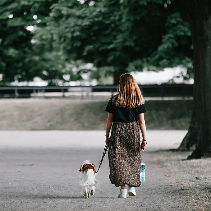- Optional Colors Sizes & Poop Bag Holder: There are multiple fashion colors and 3 sizes(10oz, 15oz and 20oz). Inner poop bag holder is designed in the bottom of bottle, pull the poop bag out through the gap on the bottom when first use