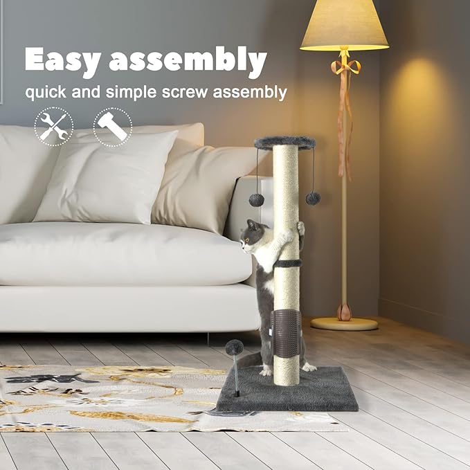 - This cat scratching post has three colors:gray,beige,light gry,brown,always meet your decor expection for matching house furniture .Simple screw-together assembly - instruction and tools included.Easy to assemble and disassemble