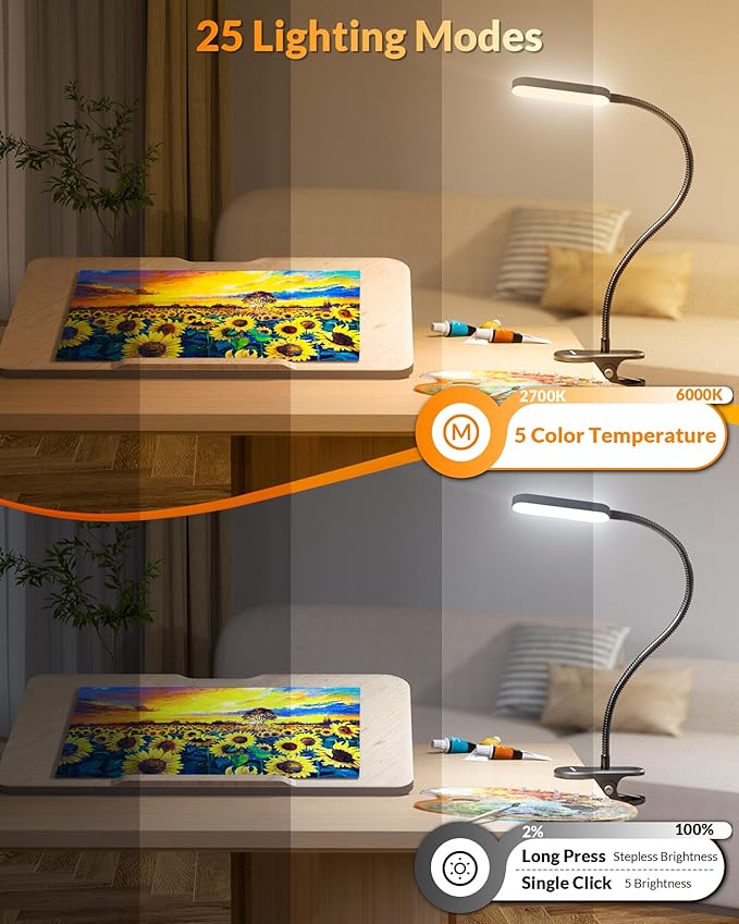 - 25+ Lighting Options: Offering Stepless dimming from 2%-100% and 5 color temperatures(2700-6000 K) to choose from, the max. 230 LM clip on light corresponds to your needs at ease
