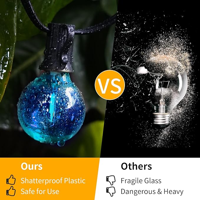 - WATERPROOF AND SHATTERPROOF: ShineU LED G40 patio lights outdoor waterproof feature a fully sealed waterproof design socket, making the outdoor string lights safe from sun and rain even in the harshest weather conditions.The bulb of our 40FT G40 outdoor string light is made of plastic. It will not break easily when dropped or blown away by the wind, making it safer to use and keeping you safe from dangerous debris.