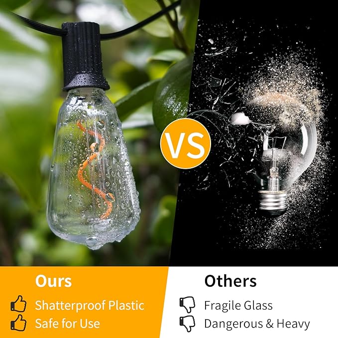 - WATERPROOF AND SHATTERPROOF: ShineU LED ST38 patio lights outdoor waterproof feature a fully sealed waterproof design socket, making the outdoor string lights safe from sun and rain even in the harshest weather conditions.The bulb of our 30FT ST38 outdoor string light is made of plastic. It will not break easily when dropped or blown away by the wind, making it safer to use and keeping you safe from dangerous debris.