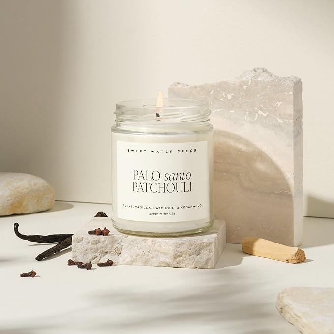 Sweet Water Decor Palo Santo Patchouli Candle - Soy Clove, Vanilla, Patchouli, Cedarwood Scented Spa Candles for Home -9oz Clear Jar + Gold Lid, 40+ Hour Burn Time, Made in The USA