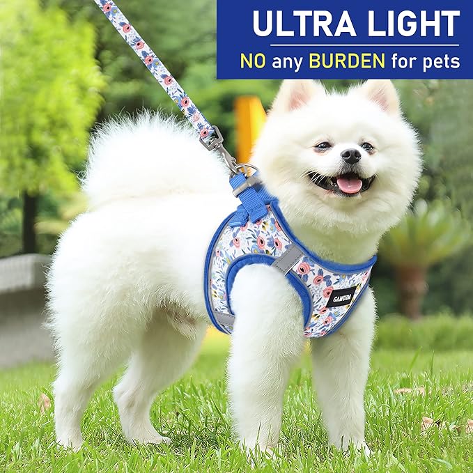 GAMUDA Small Dog Harness Collar and Leash Set, Step in No Chock No Pull Soft Mesh Adjustable Dog Vest Harnesses Plaid Reflective for Dogs Puppy Cats Kitten Rabbit (Blue Flower, XL)