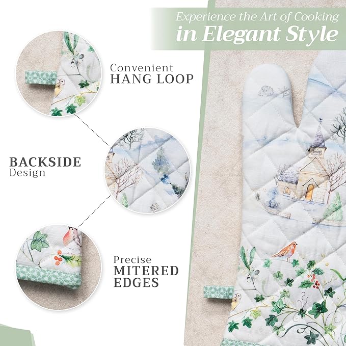 Maison d' Hermine 100% Cotton Oven Mitt & Pot Holder Set (7.5"x13" & 8"x8") Heat Resistant BBQ Cooking Gloves with Loop for Thanksgiving Christmas Decorations Handling Hot Pans (Snowy World)