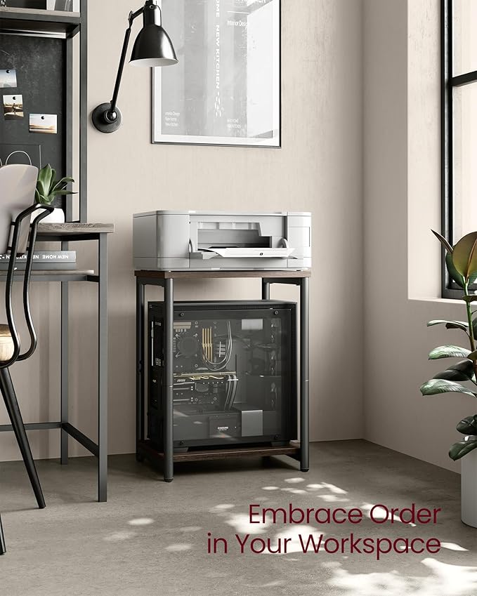 - [Strong yet Stable] 2 steel side frames lift and brace 2 particleboard panels, making a solid structure that stays put after loaded with 44 lb of items on each tier. Small unevenness in the floor? The feet are adjustable to even it out
