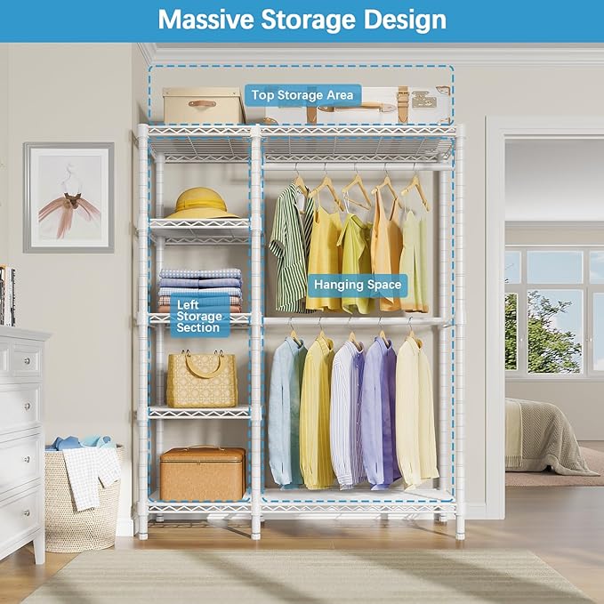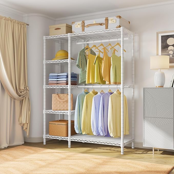 - 【Well-Organized Garment Rack】Double hanging rod is for hanging dress, suits, shirts, pants without wrinkle. And 5 tiers storage shelves provide enough place for handbag, hat, fold clothes, storage box, bedding. Say goodbye to messy!