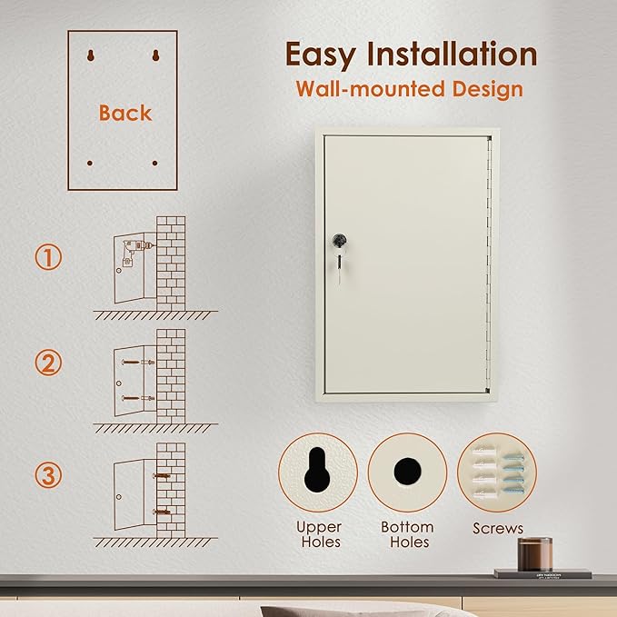 - š Wall Mount Design: The key safe cabinet features pre-drilled mounting holes and installation hardware to ensure easy and stable wall mounting. This compact key lock box can be used for many personal and business applications due to the size of 11.8Ć3.1Ć17.7 inch