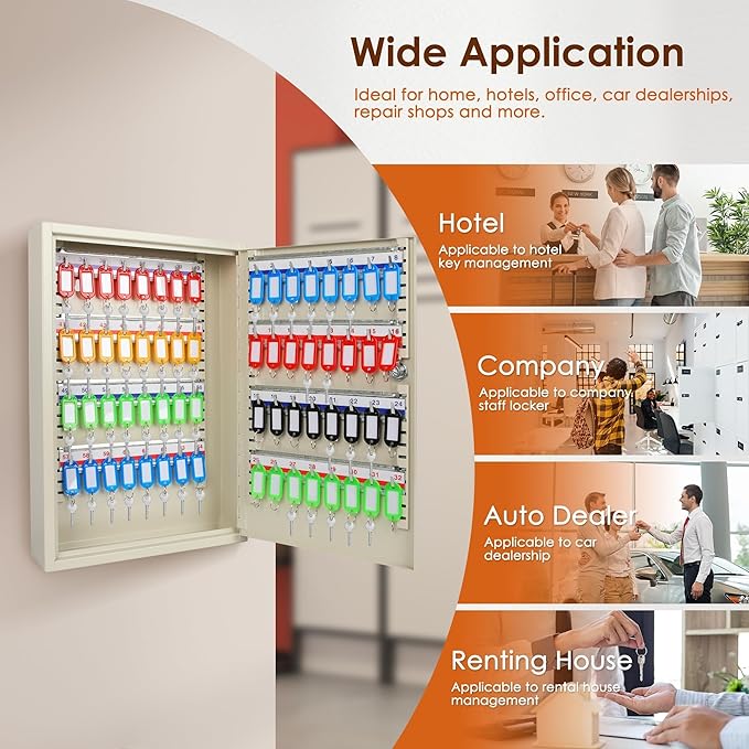 - š Widespread Application: Numbered shelves and 64 key tags can make your key organization easy and convenient. Suitable for home, hotels, valets, office, property managers, apartment complexes, car lots, car dealerships and repair shops.