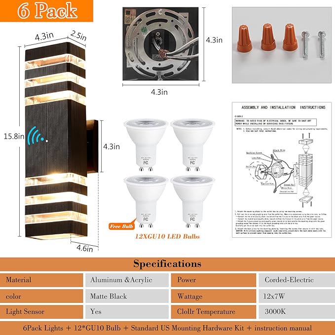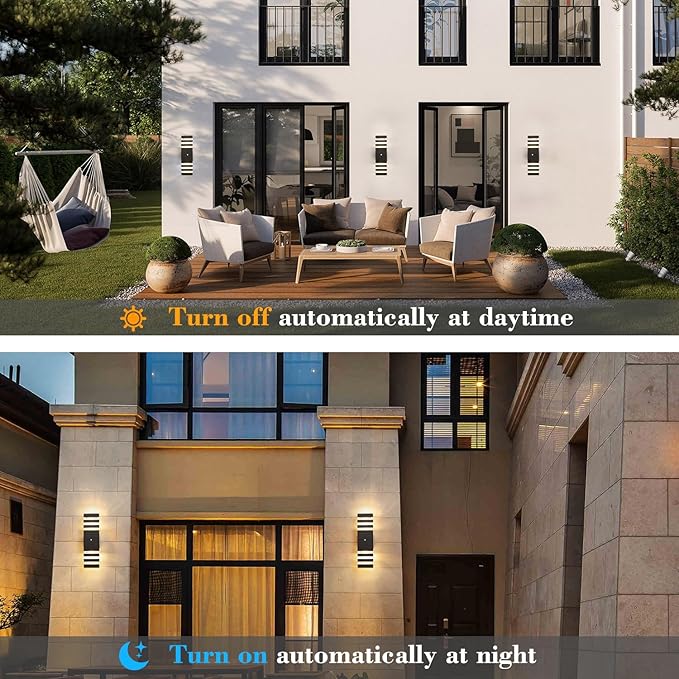 - Up&Down 2 Lights - Replaceable GU10 bulbs are included - Dusk To Dawn Outdoor Lighting:This dawn to dusk coach lights outdoor is design with 12*GU10/lights(700LM/GU10 3000K), offering enough brightness to light up your way home and helping the light emit softer and cozier light for you, bringing a warm atmosphere outside your house. The ZSMAIKU modern outdoor lights, are modern exterior lights that provide both upward and downward illumination in outdoor spaces.