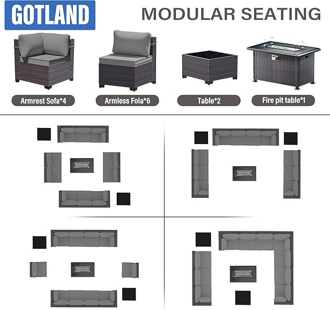 - Oversized Outdoor Furniture: This Gotland patio furniture set is designed for gatherings and seats 10-12 people, complete with 6 armless sofas, 4 corner sofas, 2 coffee table and a fire pit table. Special plastic fasteners securely lock the patio sofa together in your desired configuration, while adjustable L-shaped legs ensure steady placement on uneven ground.