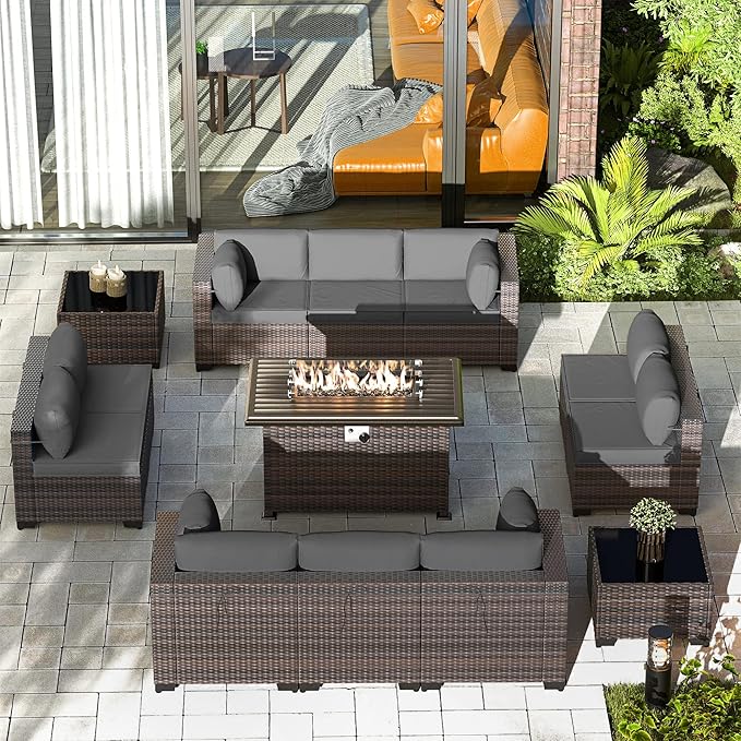 Gotland 13 Pieces Patio Furniture Set with Fire Pit Table, All Weather PE Rattan Outdoor Furniture with 29.5'' High Backrest 4’’ Thick Cushions Coffee Table, Patio Conversation Set for Deck, Gray