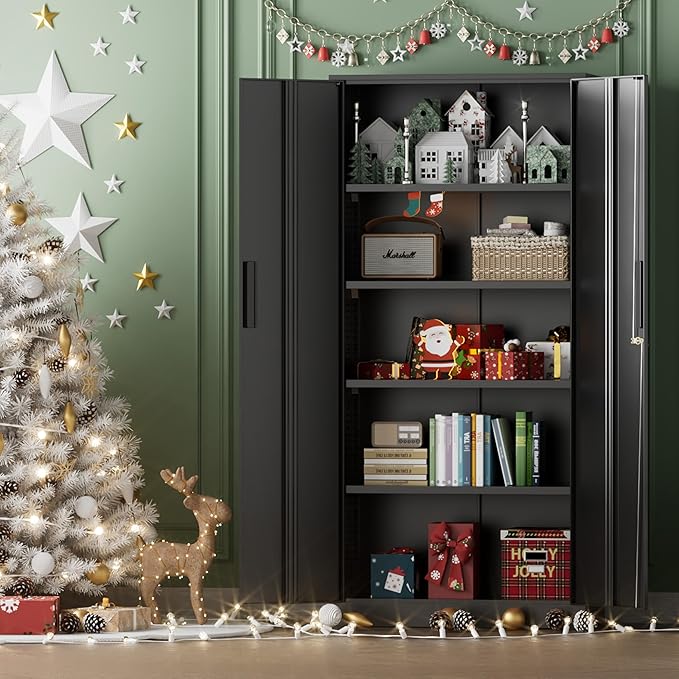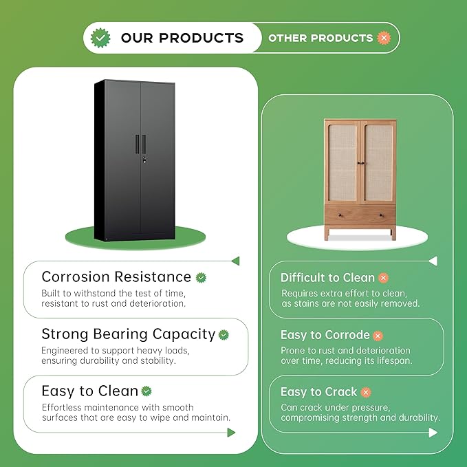 - 【Pratical design】Our tall metal cabinet equipped with 4 adjustable shelves to provide adaptability and convenience.Regardless of what your storage needs are, you have the ability to create a unique storage space to suit them.