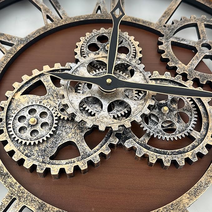 - REAL MOVING GEARS: Large wall clock with unique moving parts is as attractive as it is functional. Put batteries in, various gears start rotating fluently. Moving gear wall clock is amazing looking on the wall and will get so many compliments on it. Made from solid wood and painted by Rust-like color on wall clock create a very rustic and industrial atmosphere. Large farmhouse wall clock is professionally handmade and pursuit of naturalness, so it may have some little imperfections