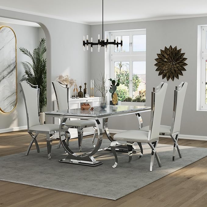 - STURDY SUPPORT : The panel of the dining table made of faux marble with a high gloss finish makes it very smooth, waterproof, heat resistant and scratch resistant-safe. This table is built to last, the whole frame is stainless metal with U shape leg design which ensures stability and durability.