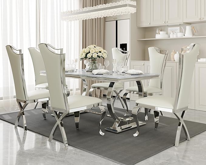 - EASY TO CLEAN : This dining room table features a gorgeous faux marble tabletop with rounded corners, which provides a smooth touch and safty. Stain resistant and Easy-to-clean surface is slightly textured to avoid scratching, dining table for 8.