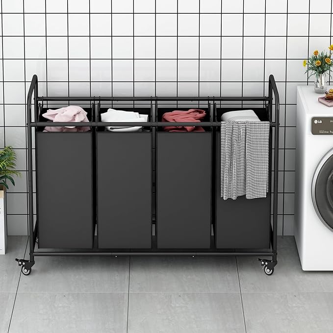 - Rolling Wheel Design: 4 heavy-duty casters allow the laundry sorter cart to move freely; the 2 rolling wheels on the 4-bag laundry sorter can be locked to keep it stationary.