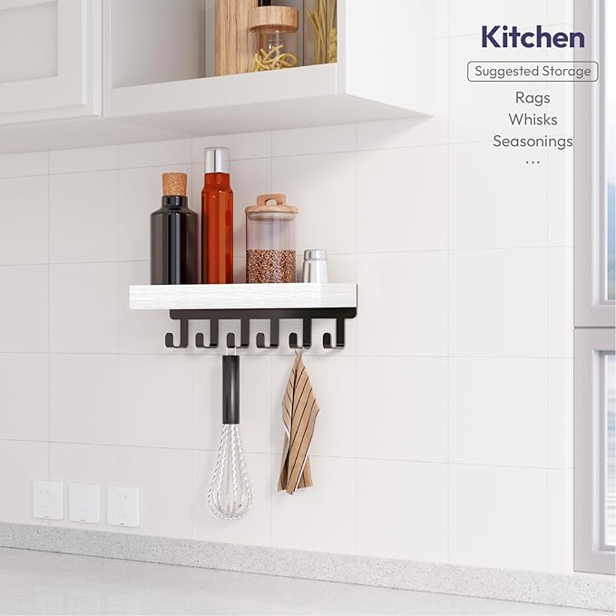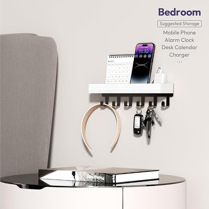 - [Mini Shelf for Daily Essentials]: This wall-mounted key holder includes 6 sturdy hooks to hang keys, lanyards, or pet leashes, plus a small top platform to hold your everyday carry. Use it to keep mail, postcards, wallets, or glasses organized and within reach as you walk in or out. A simple addition that adds real function to your entry space without bulk