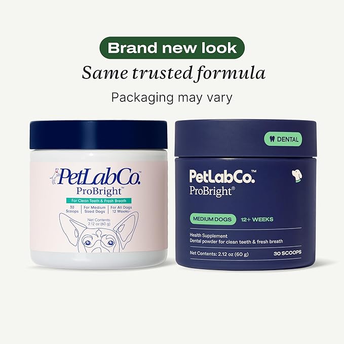PetLab Co. ProBright Dental Powder - Dog Breath Freshener - Teeth Cleaning Made Easy – Targets Tartar & Bad Breath - Formulated for Medium Size Dogs - Packaging May Vary