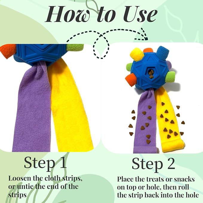 - Easy to Use And Fun: Simply untie any cloth strip end, place a snack, roll it up and put it back into the sniffing ball hole. It's a challenge your pet would be thrilled to take on pulling out the cloth, unrolling it, and find their treat!