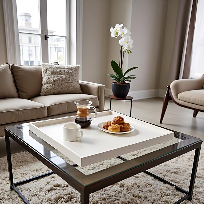 30 * 30 inches Luxury Leather Square Oversized Service Tray, Ottoman & Coffee Tray for Family Dinner, Out-of-House Picnic & Party (30 inch Beige)