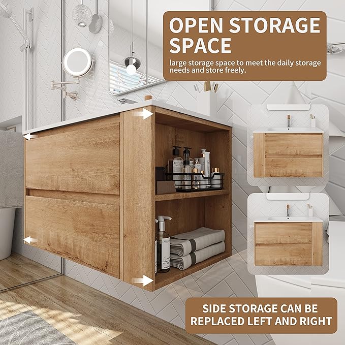 • 【Ample Storage Space】 The Floating Bathroom Vanity offer extra bathroom storage drawers and side adjustable shelf. The side rack can be installed on the right or left side according to the needs of the bathroom.