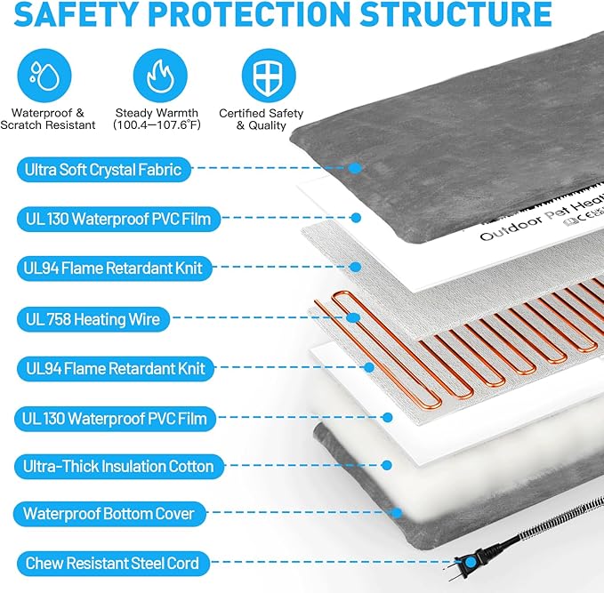 - 🐾ENERGY SAVING & SAFE 🐾 This outdoor heating pad is only 30w, thus it is more energy-savings. Anti-bite power cord design, the extra-long cord extends 5.91 feet with a 4.92 feet steel-encased chew guard. Furthermore, made of fireproof material, so it is really safe for you and your pets.