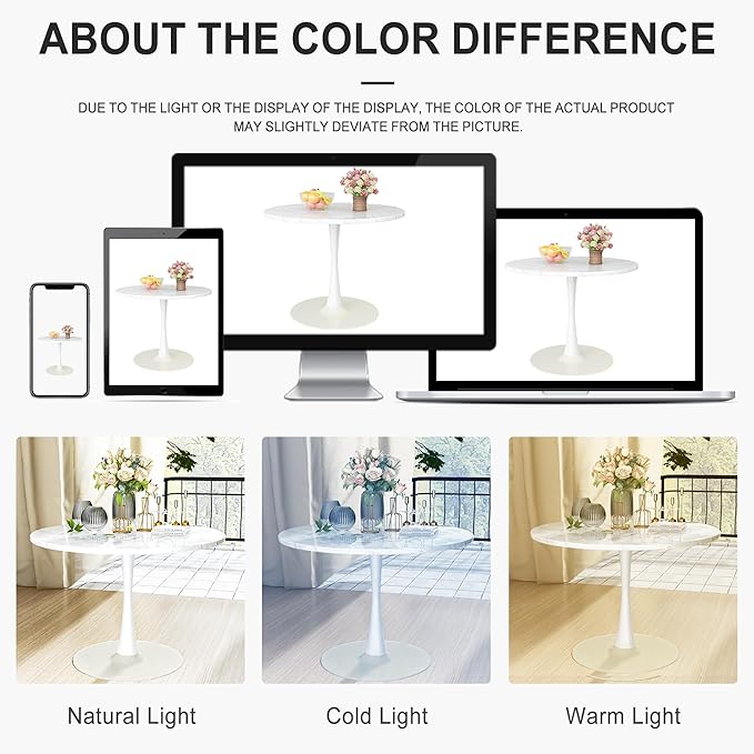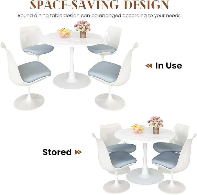 - 【Round Tulip Dining Table】: This small dining room table has a modern mid-century style, with a unique faux marble look and sleek silhouette leading to a minimalist lifestyle. The elegant round dining table has a stylish silhouette and can be used as a breakfast table, coffee table, living room table, casual tea table and outdoor dining table.