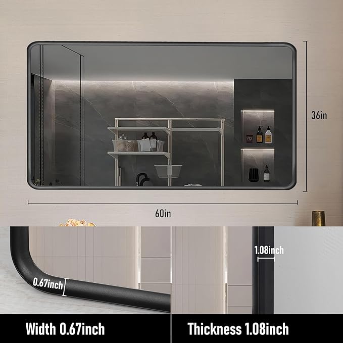 Silver Framed Mirrors for Bathroom,60 x 36 Inch Rounded Conner Rectangle Mirror for Wall, Matte Silver Vanity Mirror with Tempered Glass,Hangs Horizontally or Vertically