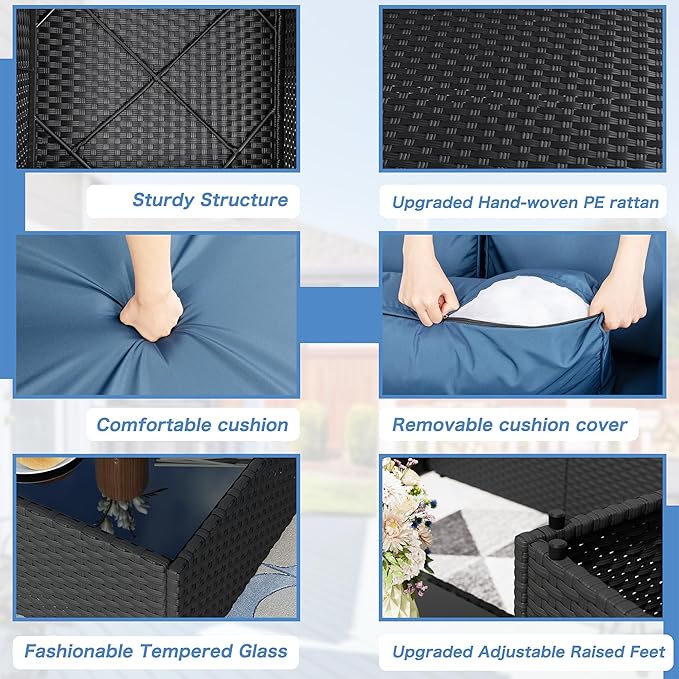 - Sturdy&Durable: Solid metal structure make it super safe to sit in the sofa set. Added bars for the frame enhance the sturdiness and allow the sofa to support heavy people about 300lbs. Adjustable feet make it steady on uneven surfaces. PE Wicker is strong enough to survive inclement weather and guarantee the set has a long service life.Note: cushions are not water-proof;(When you don' t use it, advise you to take cushions inside or buy a cover for longer service time)