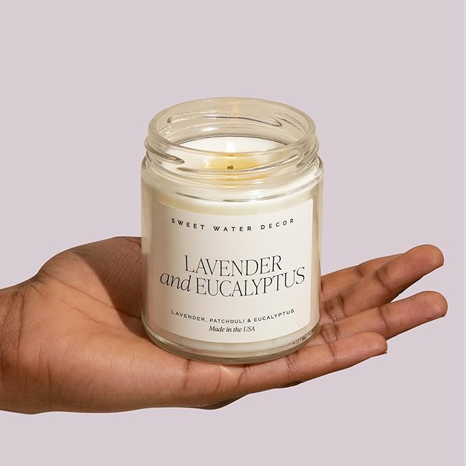 Sweet Water Decor Lavender and Eucalyptus Candle - Soy Patchouli, Eucalyptus and Lavender Candles for Home - Scented Spring Candles - 9oz Clear Jar, 40 Hour Burn Time, Made in The USA