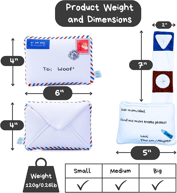- The Woof² Hong Kong Airmail Nose-work Pet Toy is the ultimate interactive dog toy & gift for your pups. This innovative 2-in-1 plush toy contains 2 components: the 'envelope' and the 'letter', where the 'letter' can be taken out for 2x the fun! They combine durability, versatility, and engagement to create an exciting and enjoyable bonding experience for dogs of all sizes and breeds, whether they are puppies or adults, big breeds or miniature breeds.