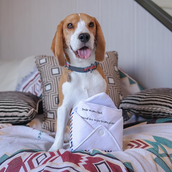 Hong Kong Airmail Soft Plush Nose-Work Squeaky Dog Toy - Durable & Cute 2-in-1 Envelope & Letter for Interactive Play, Extendable Cloth to Hide Food for Puzzle Fun, Small Medium Dogs