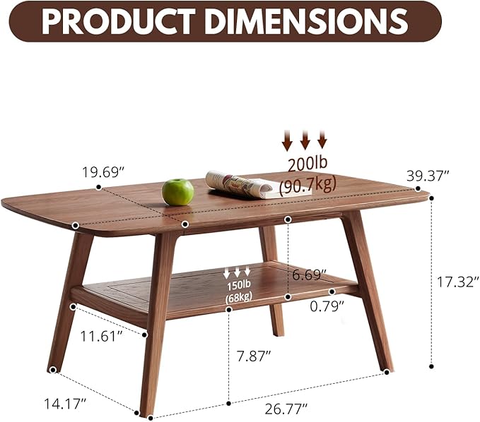 Solid Oak Wood Coffee Table - 2-Tier Modern Center Table, Living Room Tables with Double Storage for Living Rooms, Bedrooms, and Offices (Walnut, 39.37" D x 19.69" W x 17.32" H)