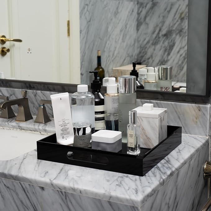 Glossy Black Acrylic Serving Tray with Handles 12x12 Inch -Spill Proof- Decorative Trays Countertop Organizer for Ottoman,Nightstand, Sidetable, Butler (12X12 Inch, Black)