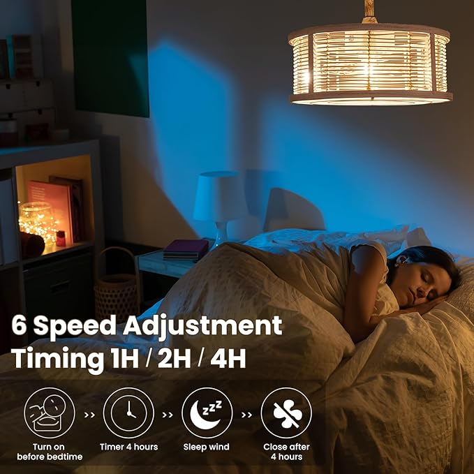 - 6 Speeds Reversible Motor: The rattan ceiling fan with light is equipped with a 6-speed reversible motor, allowing you to easily control the fan's speed and direction with the included remote control. The enclosed design ensures quiet operation, making it perfect for use in boho bedrooms or other areas where noise is a concern.