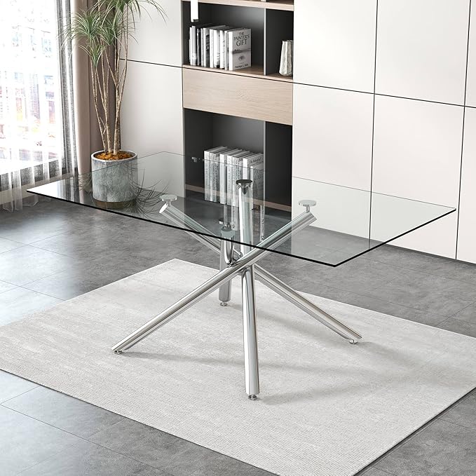 Modern Glass Dining Table for 6-8,Rectangular Glass Kitchen Table with Tempered Glass Tabletop and Silver Chrome Metal Legs for Kitchen Dining Room (Silver)