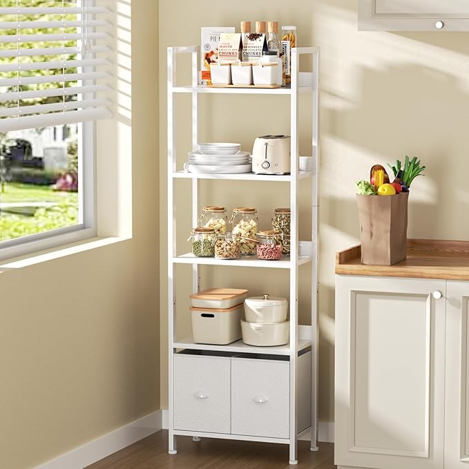 Furologee 5 Tier Bookshelf with Drawers, White Tall Bookcase with Shelves, Wood and Metal Bookshelves Storage Organizer, Modern Display Free Standing Shelf Unit for Bedroom, Living Room, Office