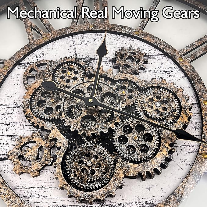 - Real Moving Gears Wall Clock: The 30 inch wall clock is design with multi-real moving gears, put battery in, various gears start working, makes a subtle relaxing sound and makes a living element in the environment in where it is placed, vintage and magical, catch all eyes of visits